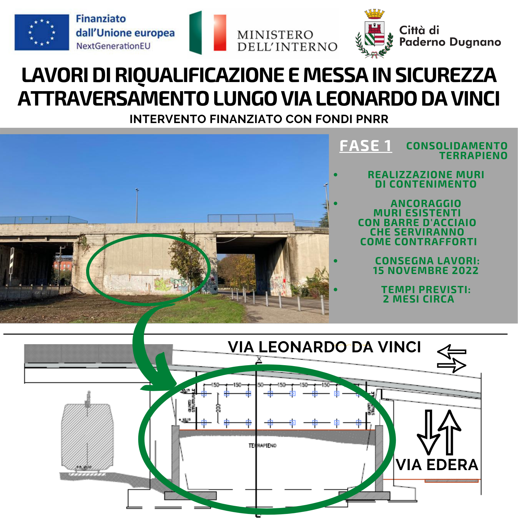 I lavori della prima fase riguarderanno il consolidamento del terrapieno compreso tra la linea ferroviaria e la via Edera, quindi su quella parte di sostegno in corrispondenza della quale si avvertono gli avvallamenti percorrendo via Da Vinci.