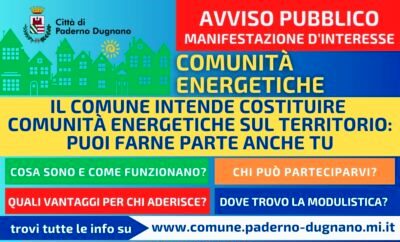 Il Comune di Paderno Dugnano intende promuovere la costituzione di Comunità Energetiche da fonti Rinnovabili (CER) sul territorio comunale attuando così uno degli obiettivi del Piano d’Azione per l’Energia Sostenibile ed il Clima – PAESC (per saperne di più clicca qui).