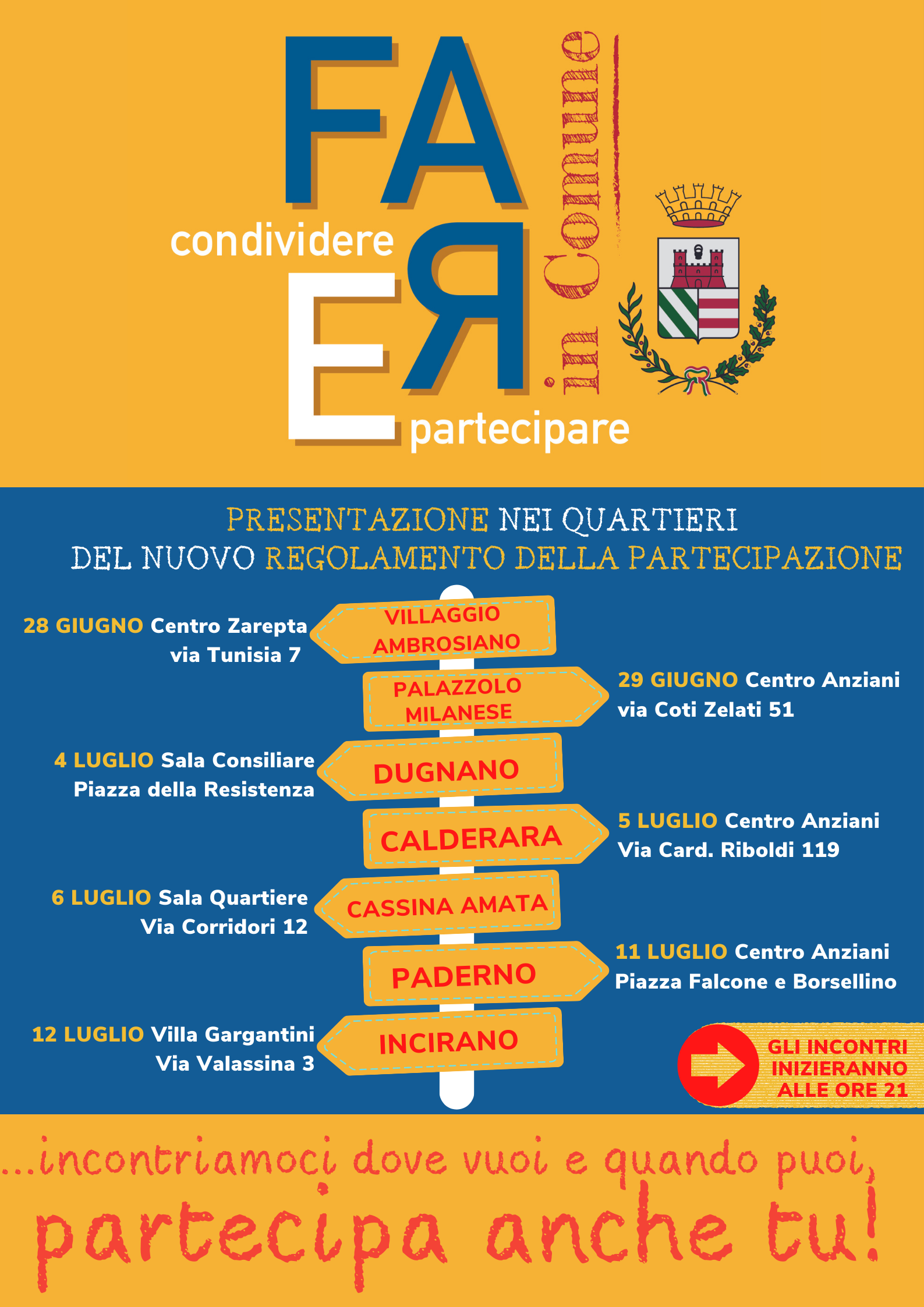 Abbiamo organizzato un calendario di incontri in tutti i Quartieri della nostra città per illustrare il nuovo Regolamento per la Partecipazione approvato dal Consiglio Comunale.