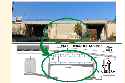 Attuazione del primo lotto di interventi conseguenti alle verifiche, condotte sui ponti stradali presenti sul territorio, delle condizioni statiche e dei relativi livelli di sicurezza idrogeologica e sismica attraverso sondaggi, prelievi, prove di carico e rilievi strumentali, per prevenire possibili rischi in considerazione dell’età di costruzione e delle sollecitazioni statiche e dinamiche a cui sono costantemente sottoposte le strutture. Progetto focalizzato sui ponti ad alta priorità di intervento ed in particolare sul manufatto posto a scavalco della Via Edera, della linea ferroviaria FNM Milano-Asso e del Torrente Seveso (via Leonardo da Vinci)