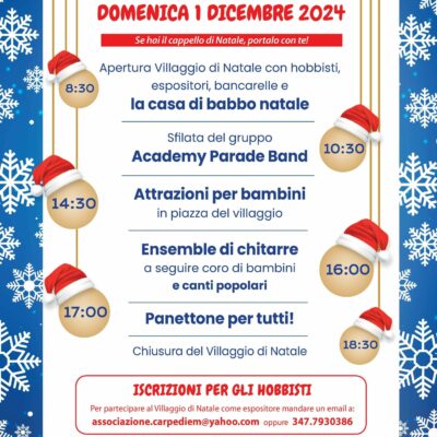 Per partecipare al Villaggio di Natale come espositore mandare una mail a: associazione.carpediem@yahoo.com oppure 347.7930386